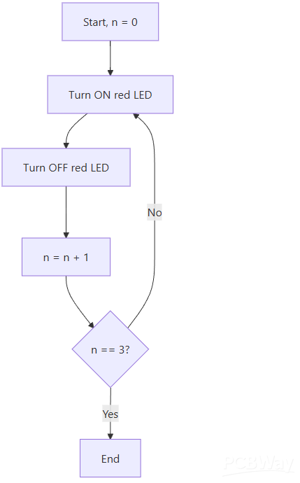 The AI will parse this flowchart and generate the corresponding commands to blink an LED three times.
