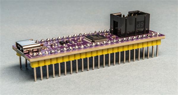 Headers are provided for programming the microcontroller via UPDI, either via a six-pin (3x2) connector compatible with the Atmel-ICE or via serial. The latter has a diode between the TX and RX pins.