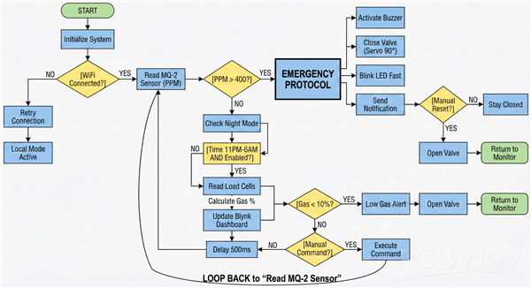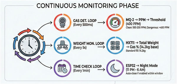 Weight Monitoring Loop (every 5 seconds): The HX711 reads the combined signal from all four load cells, applies the calibration factor, and calculates total weight. Subtracting the empty cylinder weight (typically 15kg) gives the remaining gas weight. This converts to a percentage based on the standard 14.2kg fill.