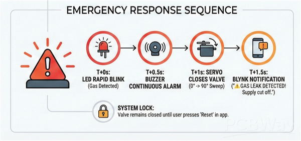 Emergency Response Sequence: When MQ-2 detects PPM levels above 400:
