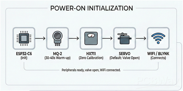 Power-On Initialization: When SafeGuard boots up, the ESP32-C6 initializes all peripherals. The MQ-2 sensor provides usable readings after just 30-40 Seconds of warm-up. The HX711 performs a zero calibration, and the servo -moves to its default position (gas valve open). WiFi connects to your home network, and the Blynk app establishes communication.