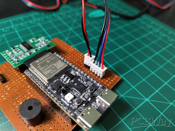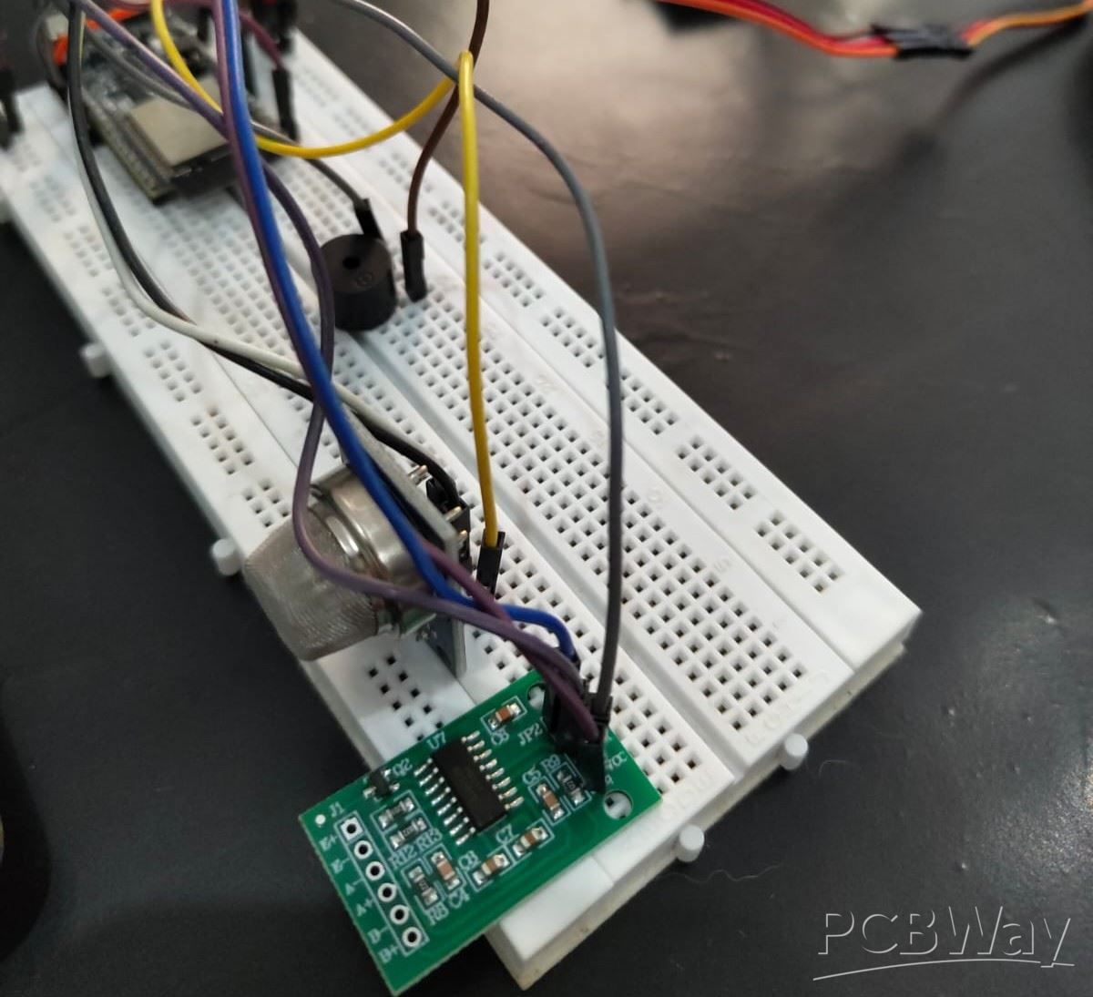 Power Distribution: The 5V power bank connects directly to the common power bus. The ESP32-C6 has an onboard 3.3V regulator that powers its internal logic. The MQ-2 sensor module has its own onboard regulator, so it safely accepts 5V input. The servo and buzzer run directly on 5V.