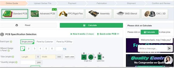 Go to the PCBway instant quote page and fill in the relevant design parameters, as shown below.