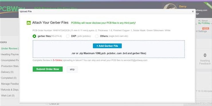 Add Gerber files, then click submit to order. You will get a message order successful.
