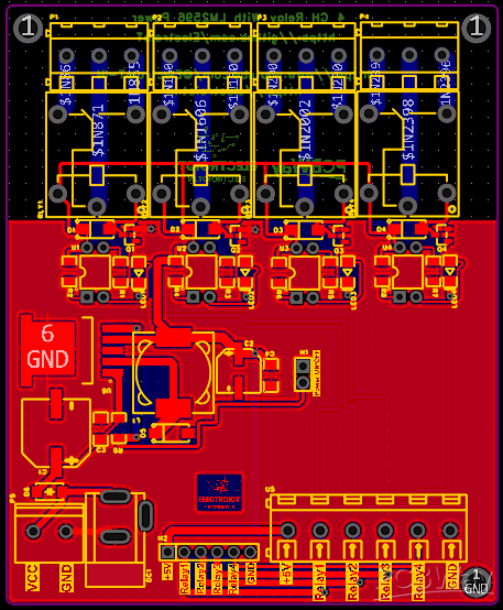 High current relay contact traces: 4mm+ copper pour (supports up to 10A)