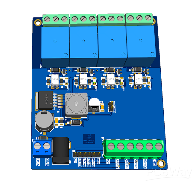 In this project, I designed an advanced 4-channel 5V relay module with an integrated LM2596 buck converter power supply, making it compact, efficient, and beginner-friendly. Unlike regular relay boards, this version includes reverse polarity protection, ON/OFF control jumper, and improved LED indicators.