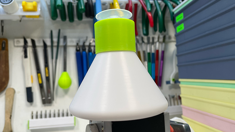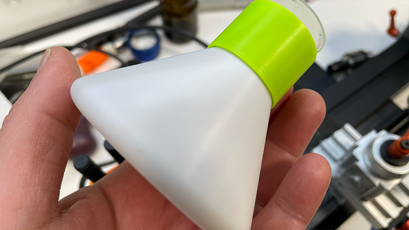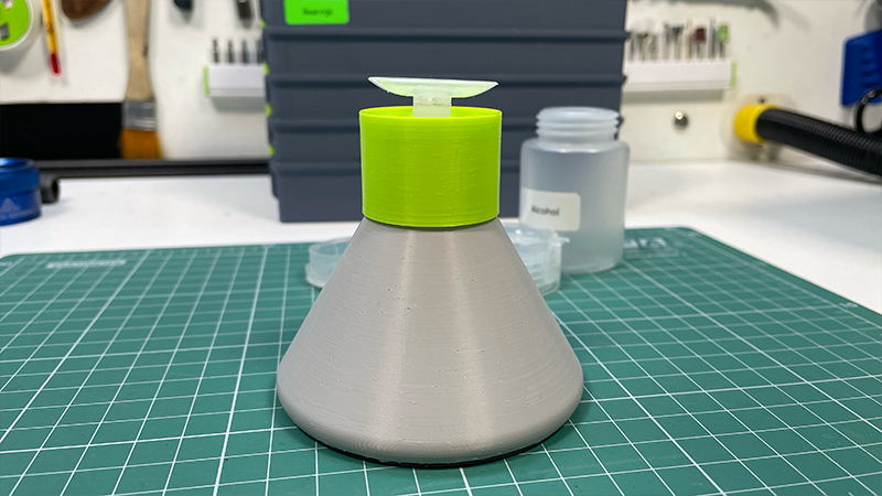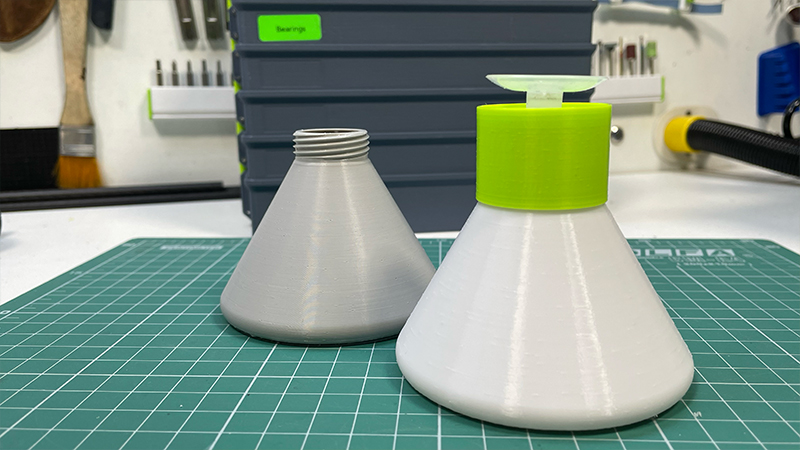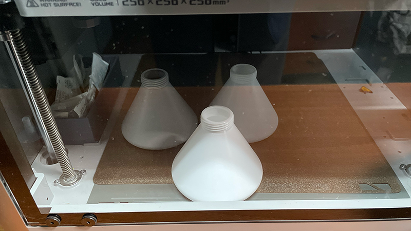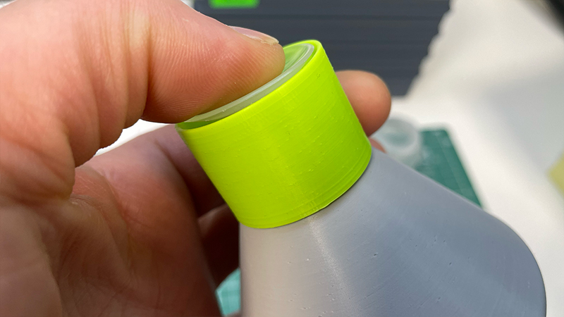 I printed the lid from ABS. The material is not critical since its contact with alcohol is minimal. Ideally, the bottle should be printed from polyamide or polycarbonate, but these plastics require drying and experience. I used PETG instead—it is inert to alcohol and easy to print. However, not all PETG types have good interlayer adhesion. If the seal is imperfect, you can treat the inner walls with dichloromethane, which will fill microcracks. Alternatively, you can increase the plastic flow rate but disable automatic flow calibration if your printer supports it.