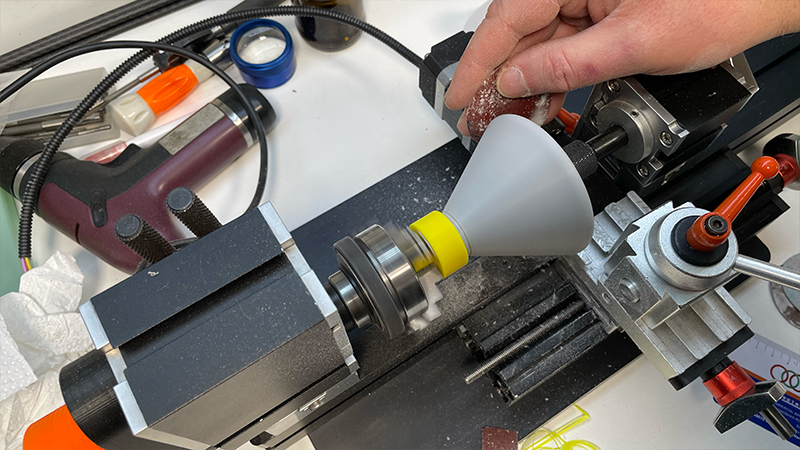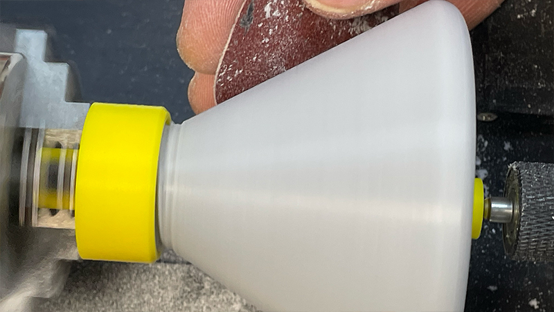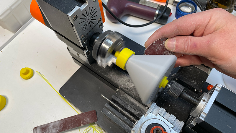 I just couldn’t resist leaving the surface unfinished. To refine it, I made a fixture to secure the bottles and lids in a benchtop lathe. After that, I sanded them down, and since the lids are made of ABS, I coated them with a clear matte acetone-based lacquer. This gave the lids a more natural, finished look—after sanding, of course.