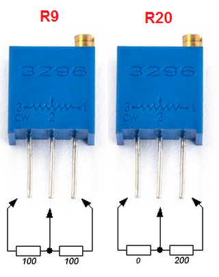 В качестве подстроечных резисторов R9 и R20, допускается использовать только многооборотные резисторы типа 3296W. Допускается использовать подстроечные резисторы с сопротивлением от 200 до 470 Ом;