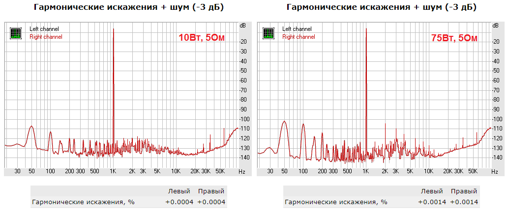 THD + шум(1 кГц, 75 Вт, 5 Ом) = не более 0.0015 %;