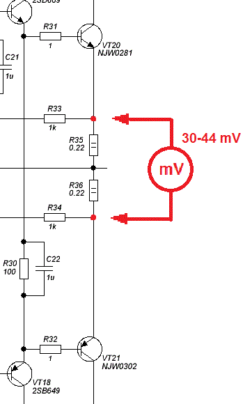 1. Щупы мультиметра (милливольтметра), необходимо подключить к эмитерам выходных транзисторов (VT20 и VT21), как показано на иллюстрации;
