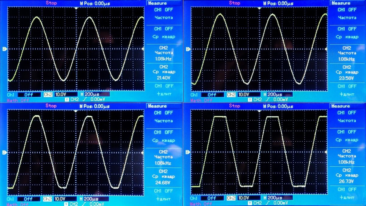 Осциллограммы выходного напряжения усилителя, при близких к клиппингу значениях выходного напряжения