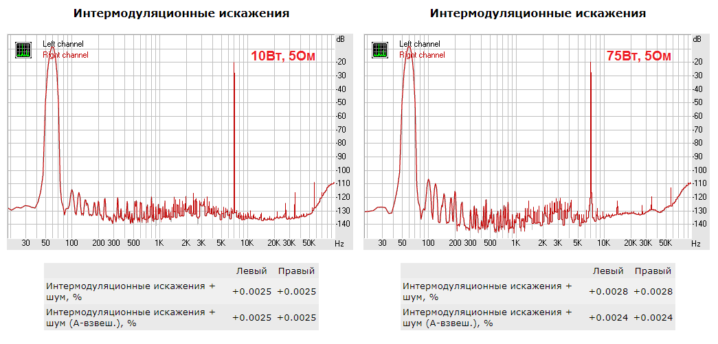 IMD + шум (60 Гц + 7 кГц, 75 Вт, 5 Ом) = не более 0.003 %.