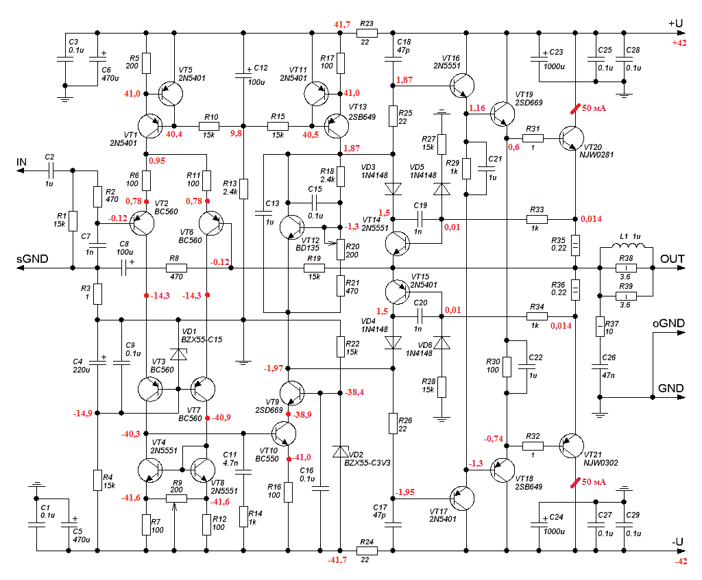 Данная карта напряжений справедлива при напряжении питания +/- 42 В. Некоторые значения напряжений на ней зависят от напряжения питания, другие - не зависят.