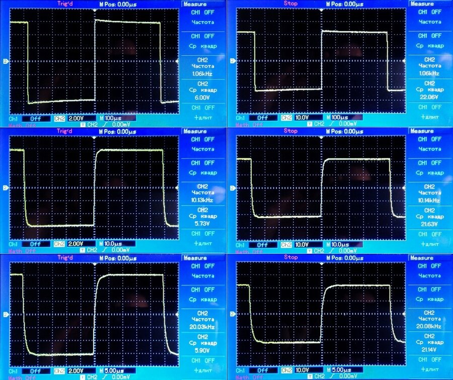 Осциллограммы выходного напряжения усилителя, при работе с сигналом прямоугольной формы