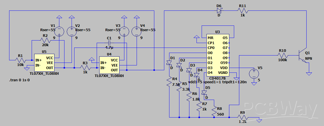 The line continues then to connect to the 5V LDO HT7350-A used to connect to VDD of the CD4017B. The 9V battery is also connected to an ICL7660 charge pump that gives us -9V which we can use ±9V for the op-amp. From there, the connections are basically same as in LTSpice. There are 0.1 bypass capacitors added to the input pins of the ICs to reduce / prevent noise.