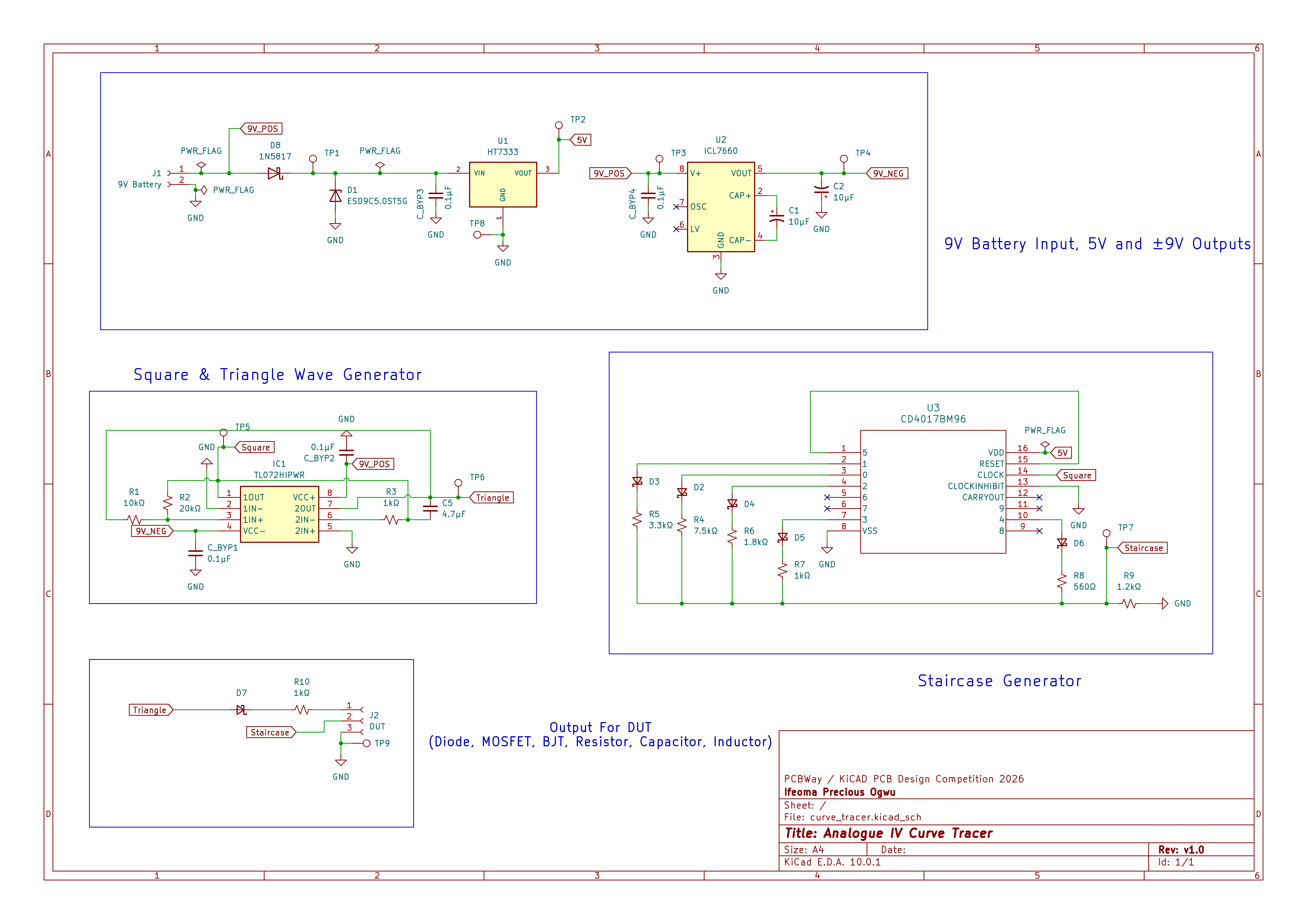 The Analog I-V Curve Tracer is a compact evaluation module designed to generate standard characteristic curves for two- and three-terminal devices on any oscilloscope equipped with an X-Y mode. By utilizing a continuous triangle wave generated by an op-amp integrator and a decade counter used to generate a staircase wave, the module safely steps base current while sweeping collector voltage.