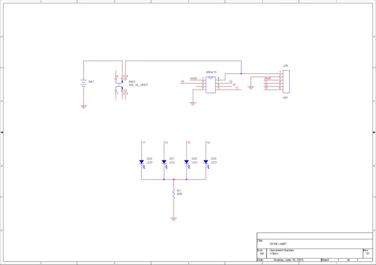 The first step is to create a schematic that includes an Attiny13A connected to four LEDs, with each LED's anode connected to the I/O pins of the Attiny13A and each LED's cathode connected to a resistance in series with GND. This load resistance is a crucial component of the circuit that will control the amount of current flowing through each LED.