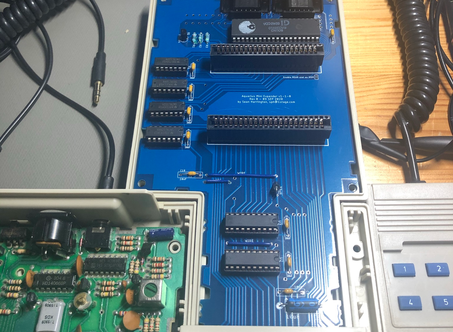 Also, this board serves as a useful prototype for how the expansion bus can be used on the Aquarius. By observing how the AY-3-8910 sound/IO chip is interfaced to the address and data bus, users who want to create their own expansion device could do so. Since it is already a very simple device (only about 25 components), the large footprint of the board could be improved through smaller SMD components and better trace routing, leaving plenty of room for additional functionality within the original (or modified) Mini Expander case.