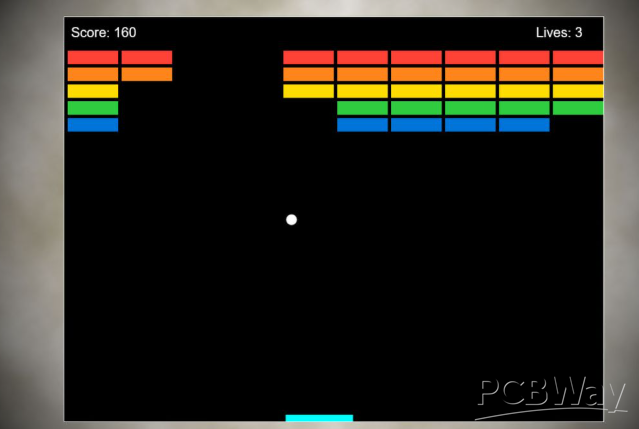 When we hit any brick with the ball, it disappears and we get one point for that. The entire game is accompanied by appropriate sounds. If we hit all the bricks, the game moves to the second level where the width of the paddle is now two pixels.