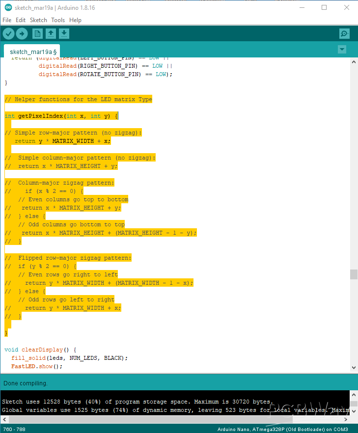 We need to select one by one of these 4 connection methods until we get the correct image on the matrix display. As for the rest of the code, although seemingly simple, there were problems with frequent repetition of an identical path of the ball, making it impossible to destroy some of the bricks, which is a consequence of the extremely small display. However, after a long experiment, I solved this part with some randomization of the ball, so the game became even more interesting. And like last time, you can see that the code is designed in such a way that all the game parameters can be changed very easily, so we can quickly adapt the game to our own needs.