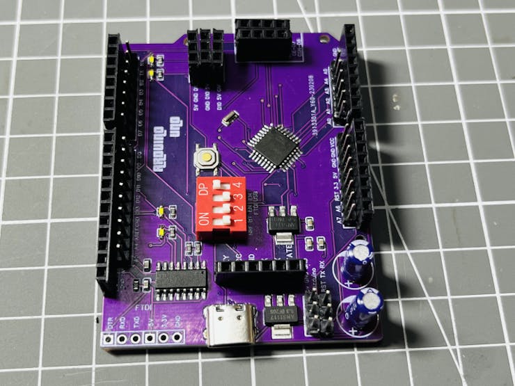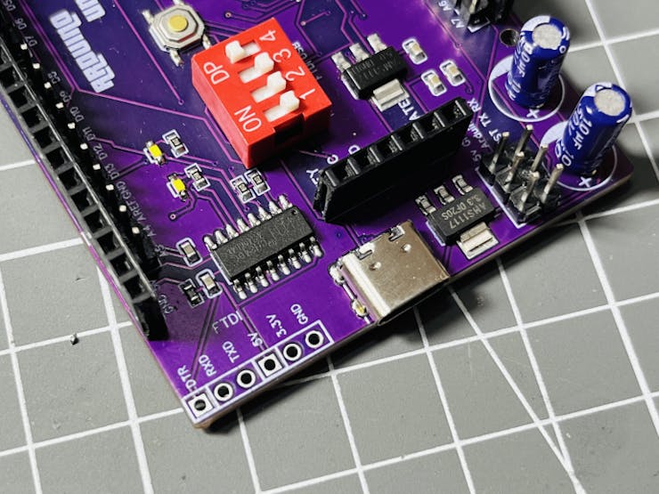 I added a FTDI features in this module, means if you want to program the any Arduino board like mini, Nano this can be directly connected to headers. No need of external programmer for that. Now you can switch between two modes of FTDI through DIP switch. 1St to program the onboard Arduino chip and 2nd to program any extremal MCU board.