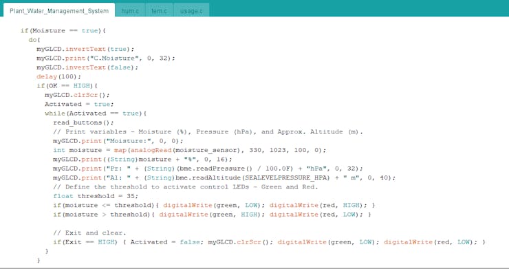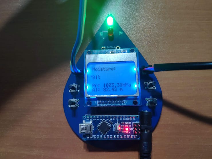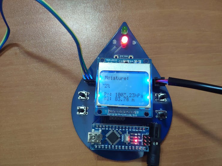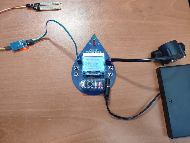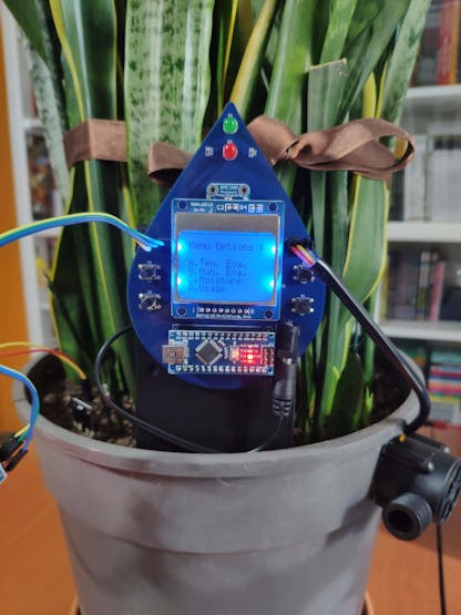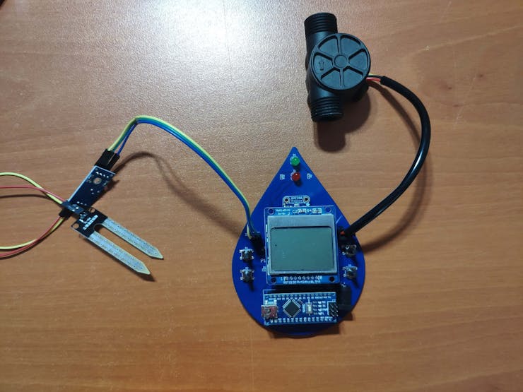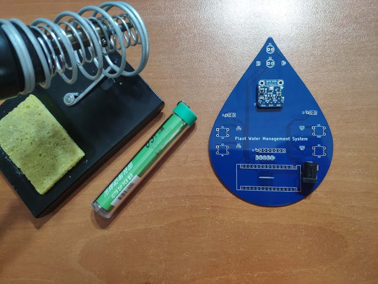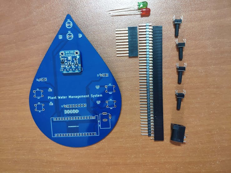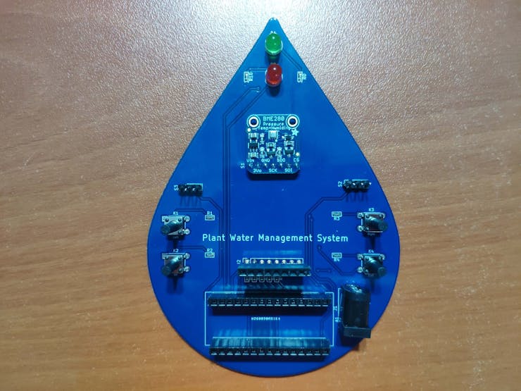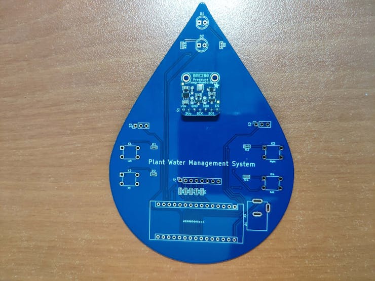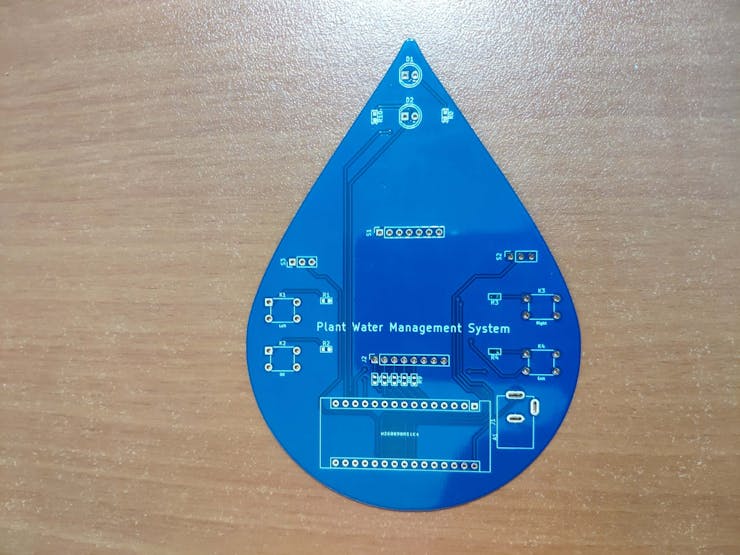 After completing my design on a breadboard and testing the code, I designed a PCB (Plant Water Management System) with a unique water drop shape to create an apt and easy-to-use accessory for houseplants :)