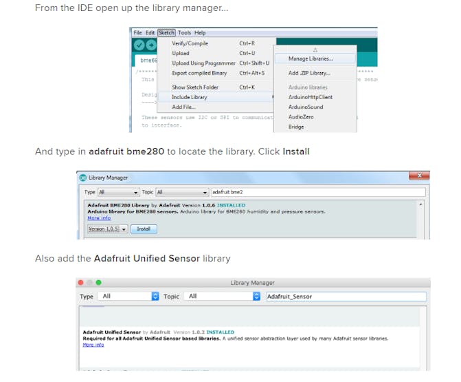 To begin reading sensor data, you will need to install the Adafruit_BME280 library (code on Adafruit github repository). It is available from the Arduino library manager.