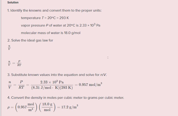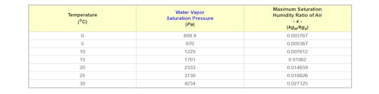 Then, we can evaluate the saturation of the air by using the percent relative humidity and the density of water vapor we just calculated.