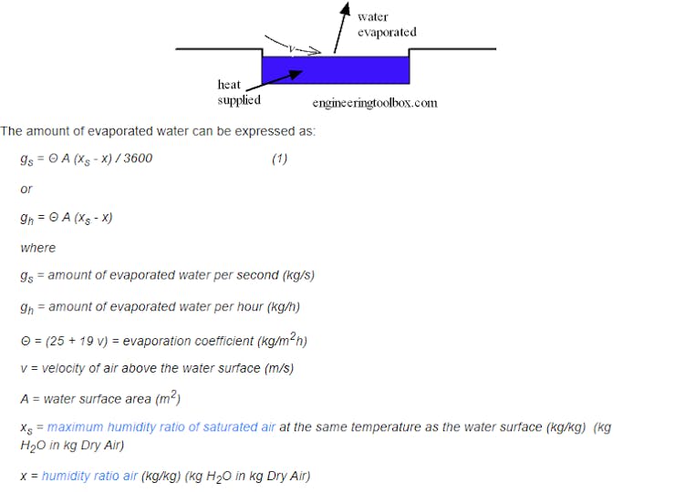 Evaporation of water from a surface depends on water temperature, air temperature, air humidity, and air velocity above the water surface. I used the following formula to calculate the amount of evaporated water approximately by humidity.