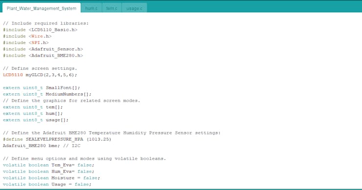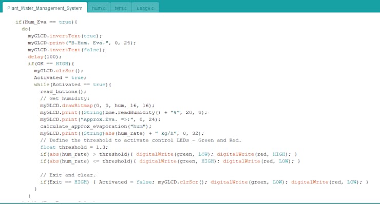 - Define menu options and modes using volatile booleans - A. Tem. Eva., B. Hum. Eva., C. Moisture, and D. Usage.
