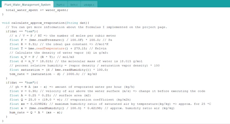 To obtain temperature, humidity, barometric pressure, and approximate altitude, I used an Adafruit BME280 I2C or SPI Temperature Humidity Pressure Sensor. Below, you can inspect the formulas I implemented to calculate the approximate evaporation rates by temperature and humidity.