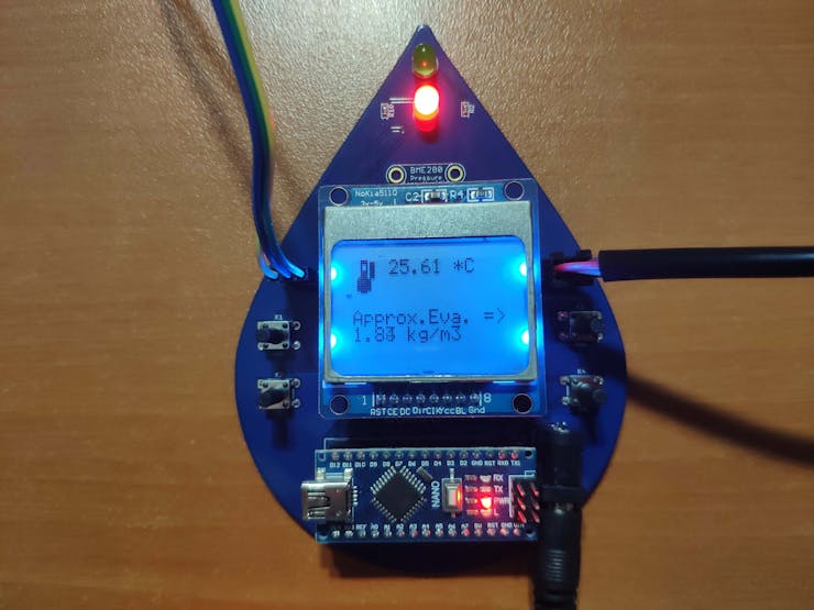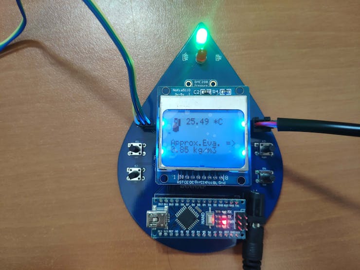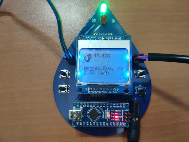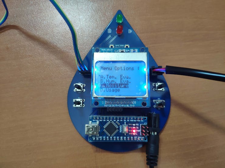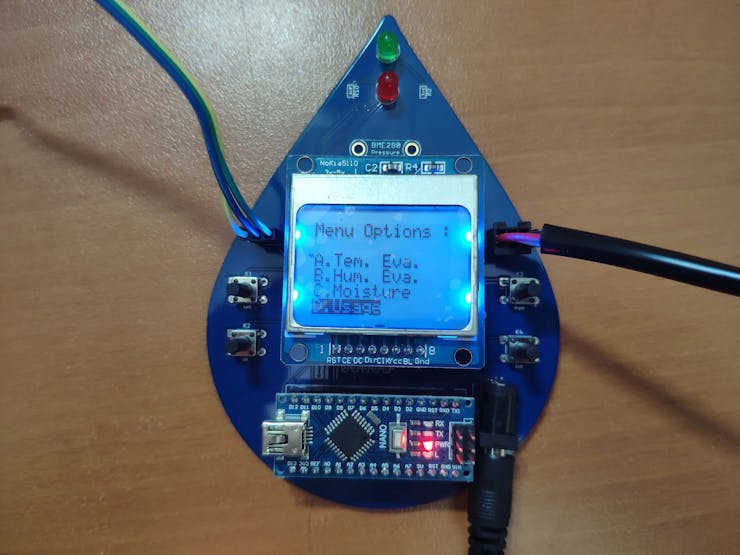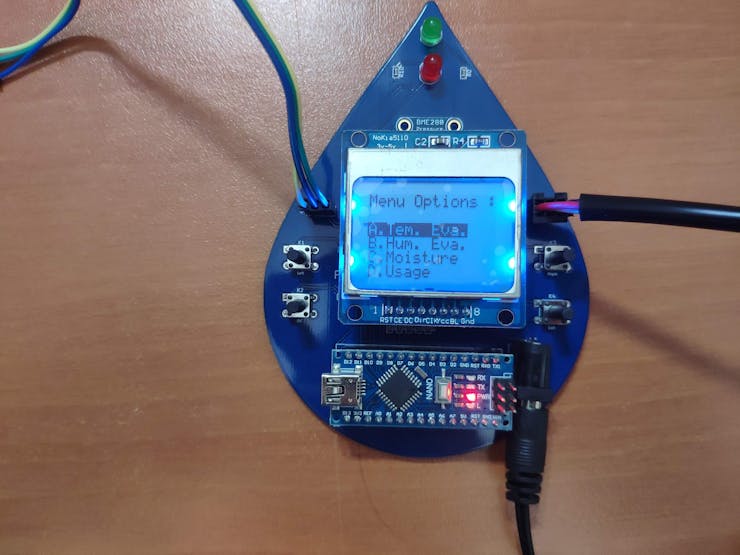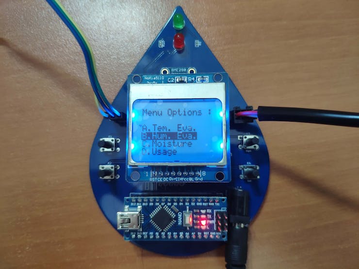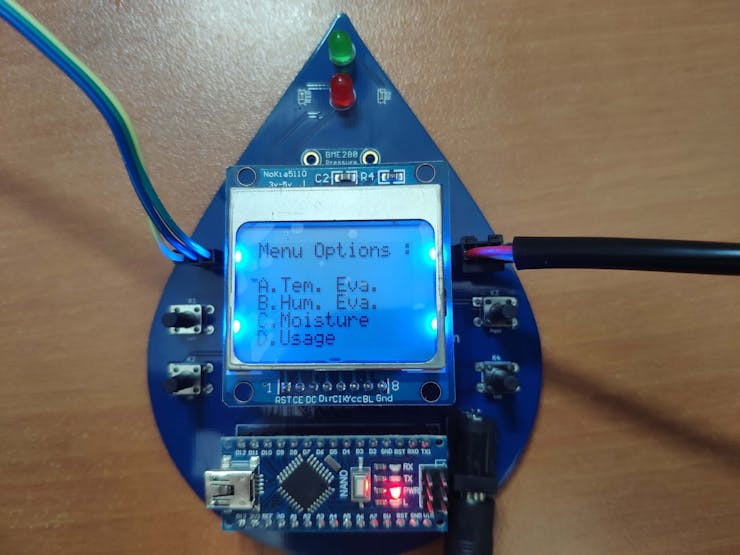 To create an interface to display the mentioned variables, select modes - A. Tem. Eva., B. Hum. Eva., C. Moisture, and D. Usage - I used a Nokia 5110 Screen and pushbuttons (6x6).
