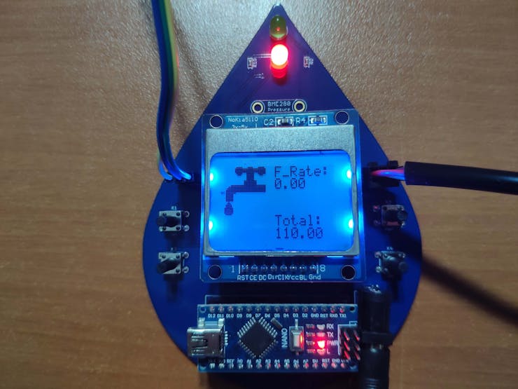 D.2) If the total volume of water spent (saved in the memory) surpasses the given threshold (100 L), the device turns on the 5mm red LED. Conversely, the device turns on the 5mm green LED.