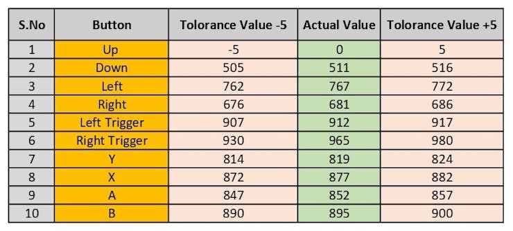 #include <Gamepad.h> Gamepad gp; void setup() { pinMode(A0, INPUT); } void loop() { int value = analogRead(A0); if (value > -5 && value < 5) //UP gp.setButtonState(0, true); else gp.setButtonState(0, false); if (value > 505 && value < 516) //DOWN gp.setButtonState(1, true); else gp.setButtonState(1, false); if (value > 762 && value < 772) //LEFT gp.setButtonState(2, true); else gp.setButtonState(2, false); if (value > 676 && value < 686) //RIGHT gp.setButtonState(3, true); else gp.setButtonState(3, false); if (value > 907 && value < 917) //LT gp.setButtonState(4, true); else gp.setButtonState(4, false); if (value > 930 && value < 980) //RT gp.setButtonState(5, true); else gp.setButtonState(5, false); if (value > 814 && value < 824) //Y gp.setButtonState(6, true); else gp.setButtonState(6, false); if (value > 872 && value < 882) //X gp.setButtonState(7, true); else gp.setButtonState(7, false); if (value > 847 && value < 857) //A gp.setButtonState(8, true); else gp.setButtonState(8, false); if (value > 890 && value < 900) //B gp.setButtonState(9, true); else gp.setButtonState(9, false); }