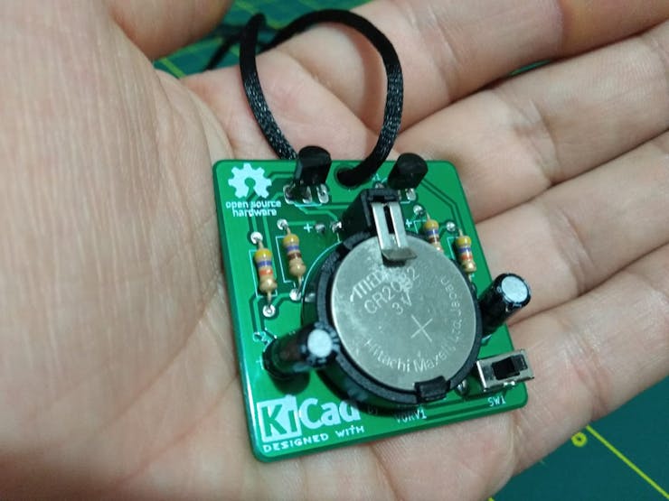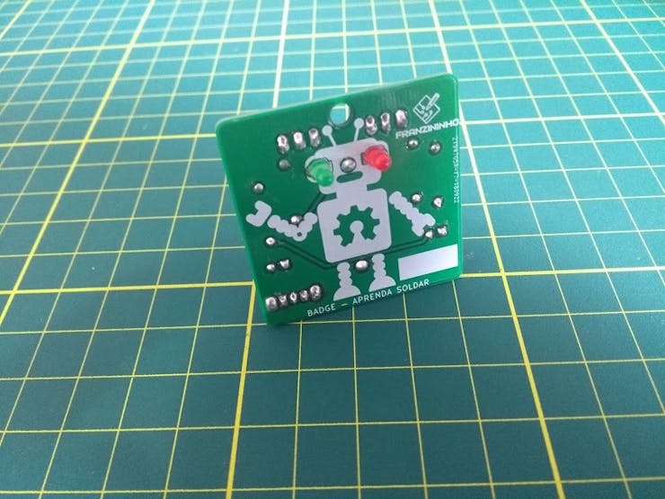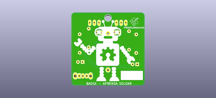 I made several electronics workshops in Brazil with the Franzininho project last year, then I realized the need for a simpler starter board. The badge circuit is an astable oscillator, which was the first circuit I made in my life a long time ago. But the badge has a nice board that everyone wants to solder when they see it. I made the PCB with a robot draw and the LEDs are the robot eyes.