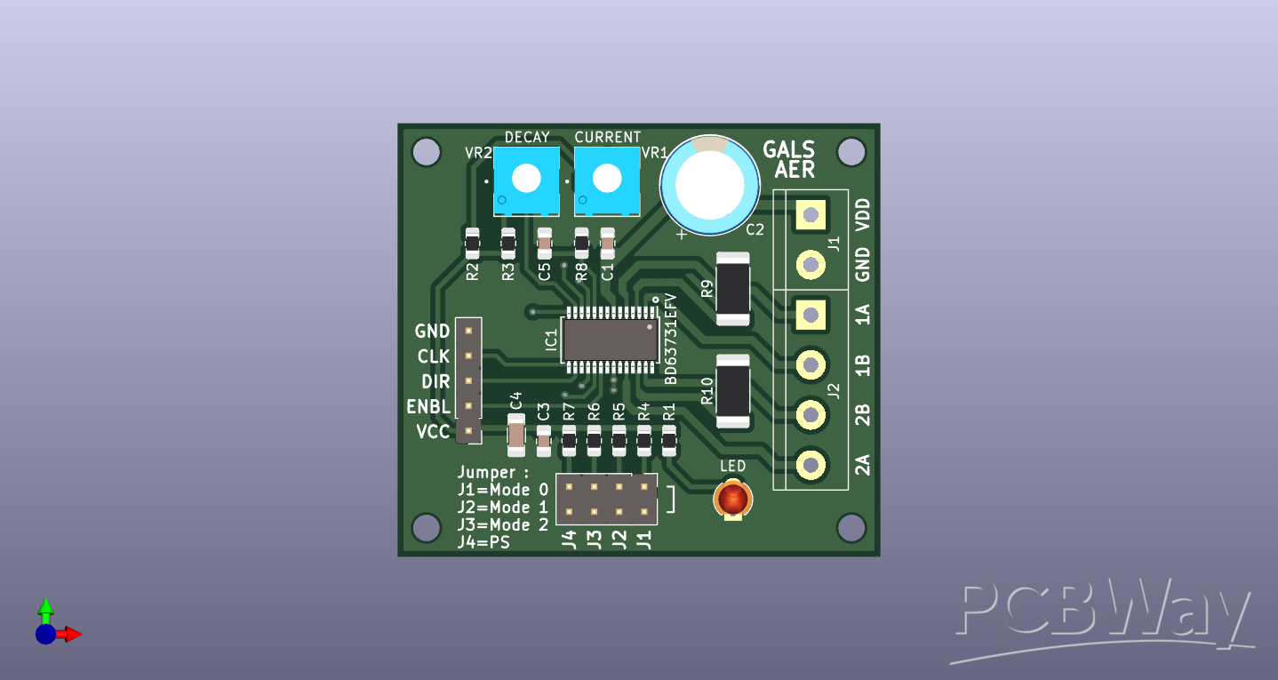 The project presented here is a bipolar stepper motor driver. It is based on BD63731EFV chip which is a low-consumption driver that is driven by a PWM signal. The power supply voltage of the project is 8 to 28V DC, and the rated output current is 3A. CLK-IN driving mode is adopted for the input interface, and excitation mode is corresponding to FULL STEP mode (2 types), HALF STEP mode (2 types), QUARTER STEP mode (2 types), 1/8 STEP mode, and 1/16 STEP mode via a built-in DAC. In terms of current decay, the SLOW DECAY/FAST DECAY ratio may be set without any limitation, and all available modes may be controlled in the most appropriate way. In addition, the power supply may be driven by one single system, which simplifies the design.