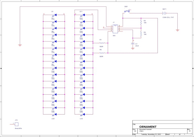 This project is a simple one; a 555 timer IC is added on the bottom side of this ornament board, 555 timer IC is configured in an astable multivibrator circuit, which is a configuration in which the output will never be in a stable state, it will turn HIGH and LOW repetitively.