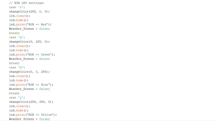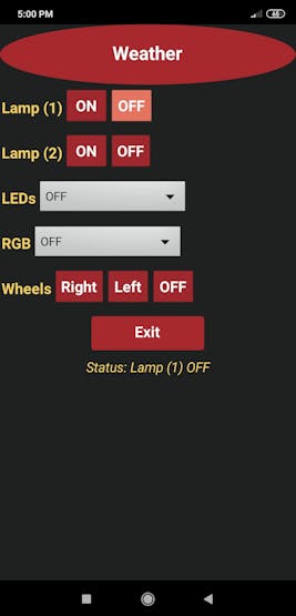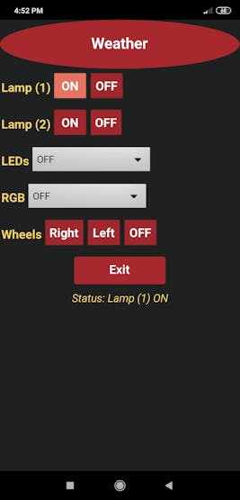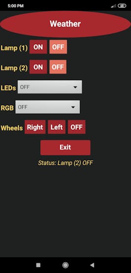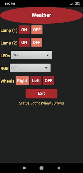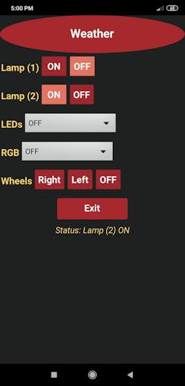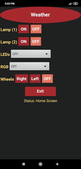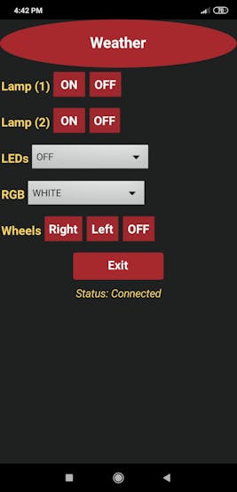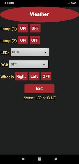 - Choosing options in the RGB slider, change the RGB color as red, green, blue, yellow, purple, cyan, white, or off - transmits 'r', 'g', 'b', 'y', 'p', 'w', 'o'.