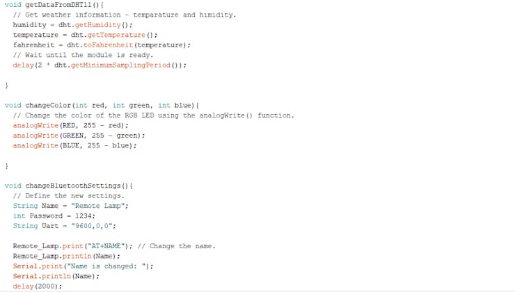 Bonus: By uncommenting the changeBluetoothSettings() function, change the Bluetooth module defaults settings using AT Commands - Name: Remote Lamp, Password: 1234, Baud Rate: 9600.