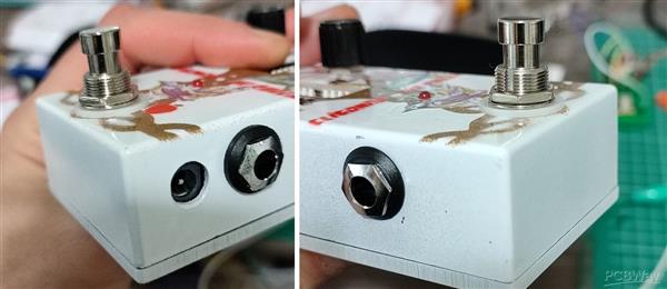 For this project I decided to go with a screw-on top jacks, they fit perfectly into Hammond 1590B type of an enclosure. Since the board is specifically designed for 60mm width enclosure, you won't be able to use it with anything else.