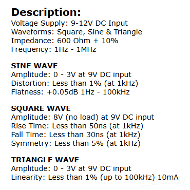 In short, the specifications of this device are: power supply from 9 to 12 Volts, sine and triangle waves with an amplitude of 0 to 3 V, and a rectangular signal with an amplitude of 8 Volts. Distortion and linearity of the signal are less than 1% up to 100 Kilohertz.