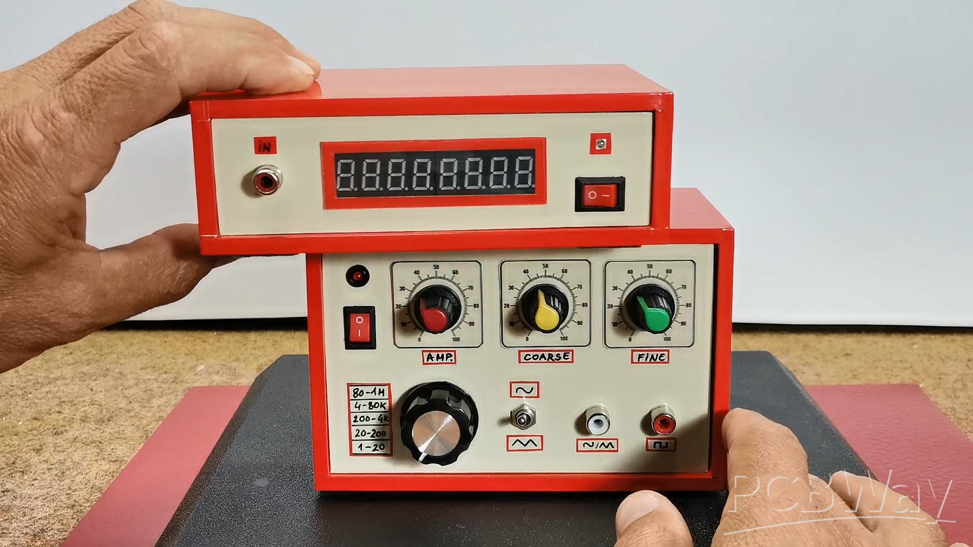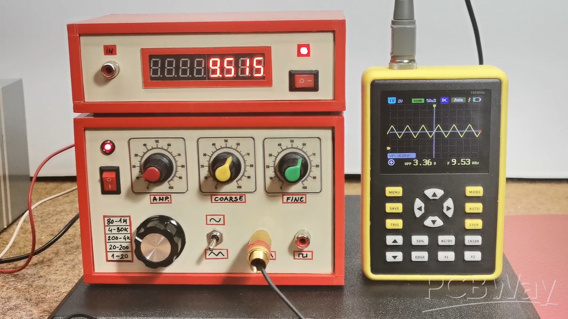 Let me just remind you that the frequency reading is done every 500 milliseconds, so we have to wait a little while for an accurate reading. With the switch we select the range and with the coarse and fine potentiometers we precisely set the desired frequency. With the first potentiometer the amplitude of the sine and triangular signals is adjusted, and it must not exceed 3 volts to avoid signal distortion. The amplitude of the rectangular signal is constant and is 8V, but here too we can set a potentiometer and regulate the value.