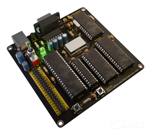 The ByteCradle 6502 is an educational single-board computer built around the 8-bit WDC 65C02 microprocessor. Designed to demystify low-level computing, it provides a practical platform for exploring computer architecture, software design, and the inner workings of simple operating systems.