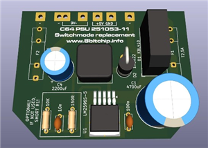 This PCB is a switchmode regulator replacement for Commodore 64 power supplies with part number 2510...