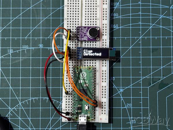 The OLED is initialized with specific dimensions and an I2C address, and the microphone is connected to pin 26, with a clap detection threshold set at 500. When the microphone detects a sound above this threshold, it registers a clap, considering a minimum delay between claps and a defined window for detecting the second clap.