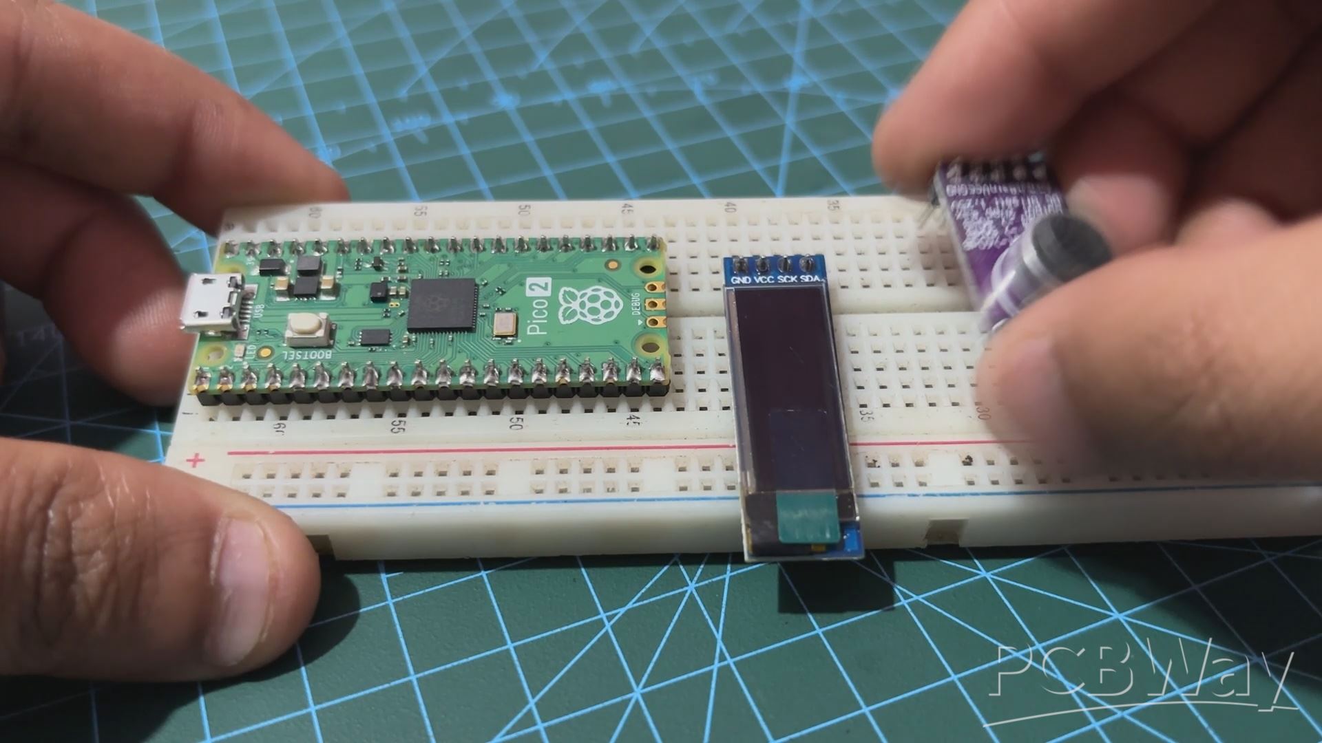 - We start the assembly process by placing all three components, which are the PICO 2, the SSD1306 OLED screen and the MAX9814 MIC Module, on the breadboard.