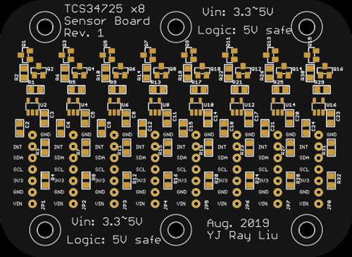 In order to scan the colour change on 96 well plates, we developed this sensor board that utilize 8 TCS34725 RGB colour sensors. With this board and a moving rail, you will be able to read all spots on the 96 well plate.
