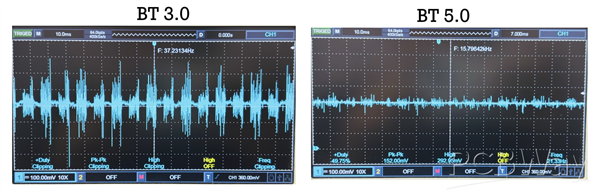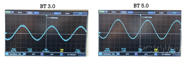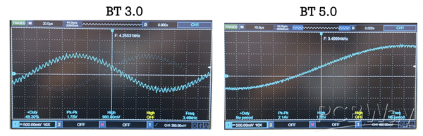 Both the bluetooth has onboard signal conditioning circuit, in 3.0 we have seen a high amplitude pulse superimposed in signal which is nothing but due to its low resolution will talk about it later. The peak-peak output of 3.0 is 1.90V and in case of 5.0 it is 2.15V. Which is 13% increment over 3.0 Gen BT.