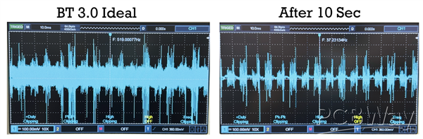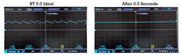 Here ideal mode is defined as the bluetooth is connected to the source but there is no signal given. The noise is compared with both BT modules. Ideally we should get a straight line when there is no signal but that is not the condition with these DSPs. I have seen a P-P noise of 650mV in 3.0 and 158mV in 5.0. This is where the 5.0 dominates and eliminates the competition. It is almost a 400% reduction in noise levels.